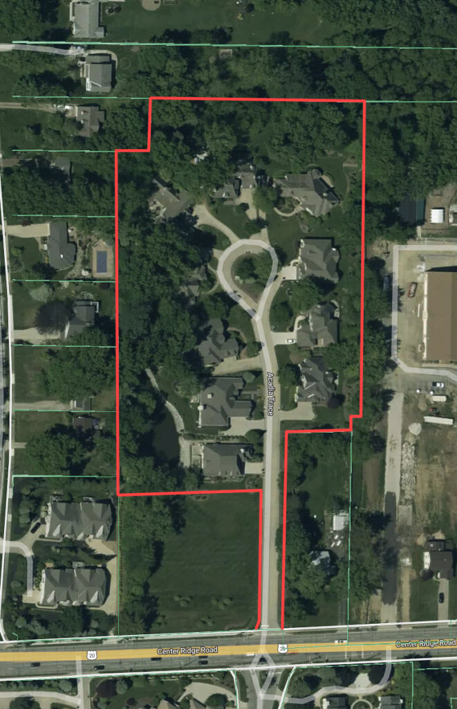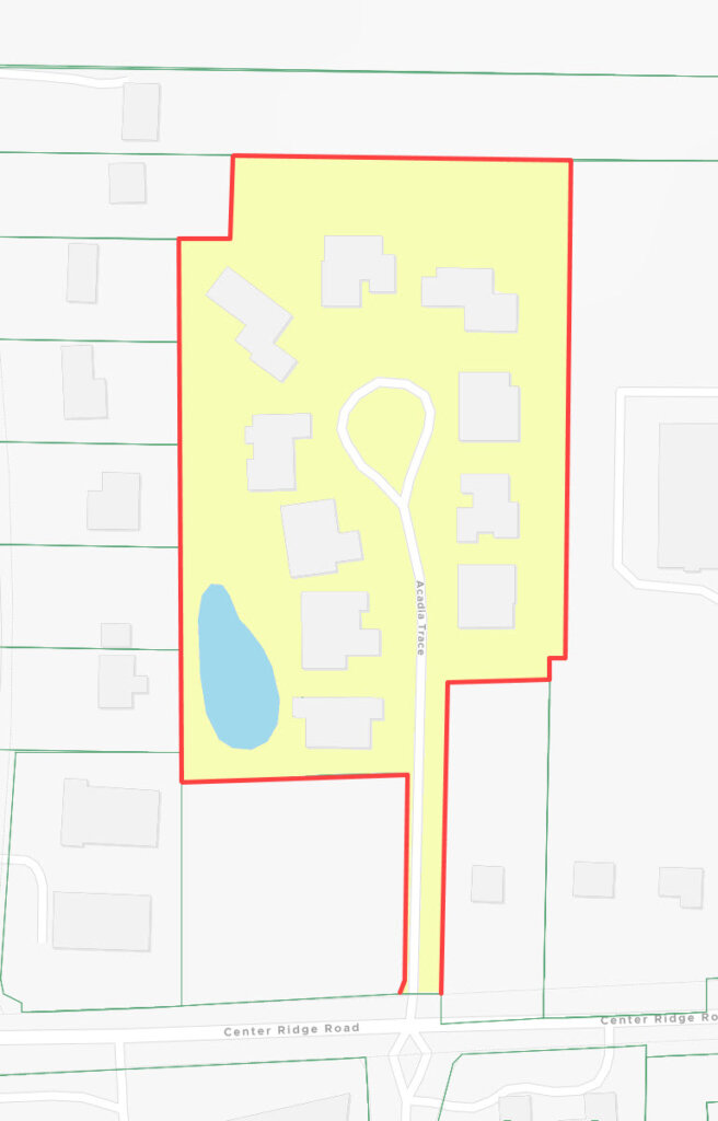 This subdivision comprises Acadia Trce, located off the north side of Center Ridge Rd, 0.3 miles east of Clague Rd.