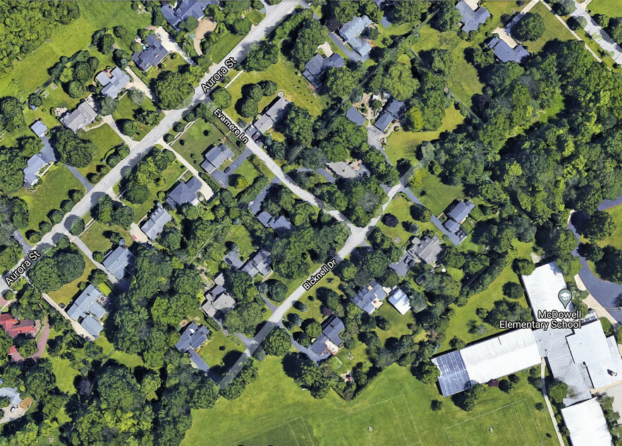 Bicknell Dr and Evamere Ln encompass 12 homes upon private drives in historic Hudson, Ohio, abutting the city’s school campus and around the corner from Western Reserve Academy. This subdivision is located off the south side of Aurora St, 0.8 miles east of N Main St, comprising Bicknell Dr, Evamere Ln, and two homes flanking the entrance at 290 and 298 Aurora St.