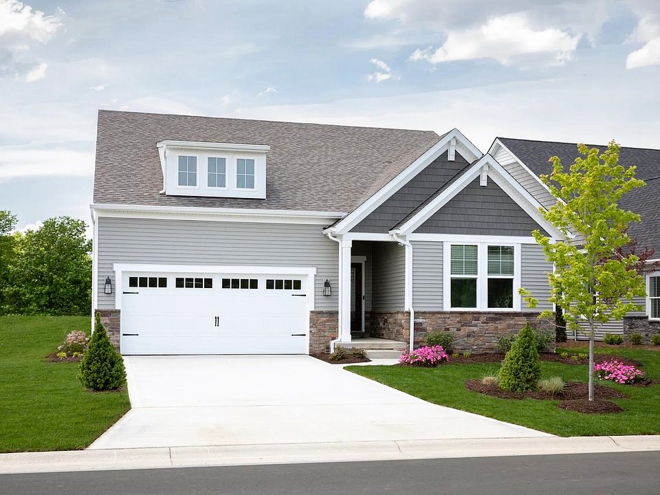 Inside, Villas of Blue Heron cluster homes feature designated foyers, garage entry mud halls, LVP flooring, private dens/flex rooms, and great rooms that open to kitchens with granite or quartz countertops, a center island with breakfast bar, pantry, and dining area. First floor owner’s suites offer walk-in closets and en suite bathrooms with dual sinks and walk-in shower. Foundations are either slab or full basement. Attached front-load garages accommodate 2 cars.