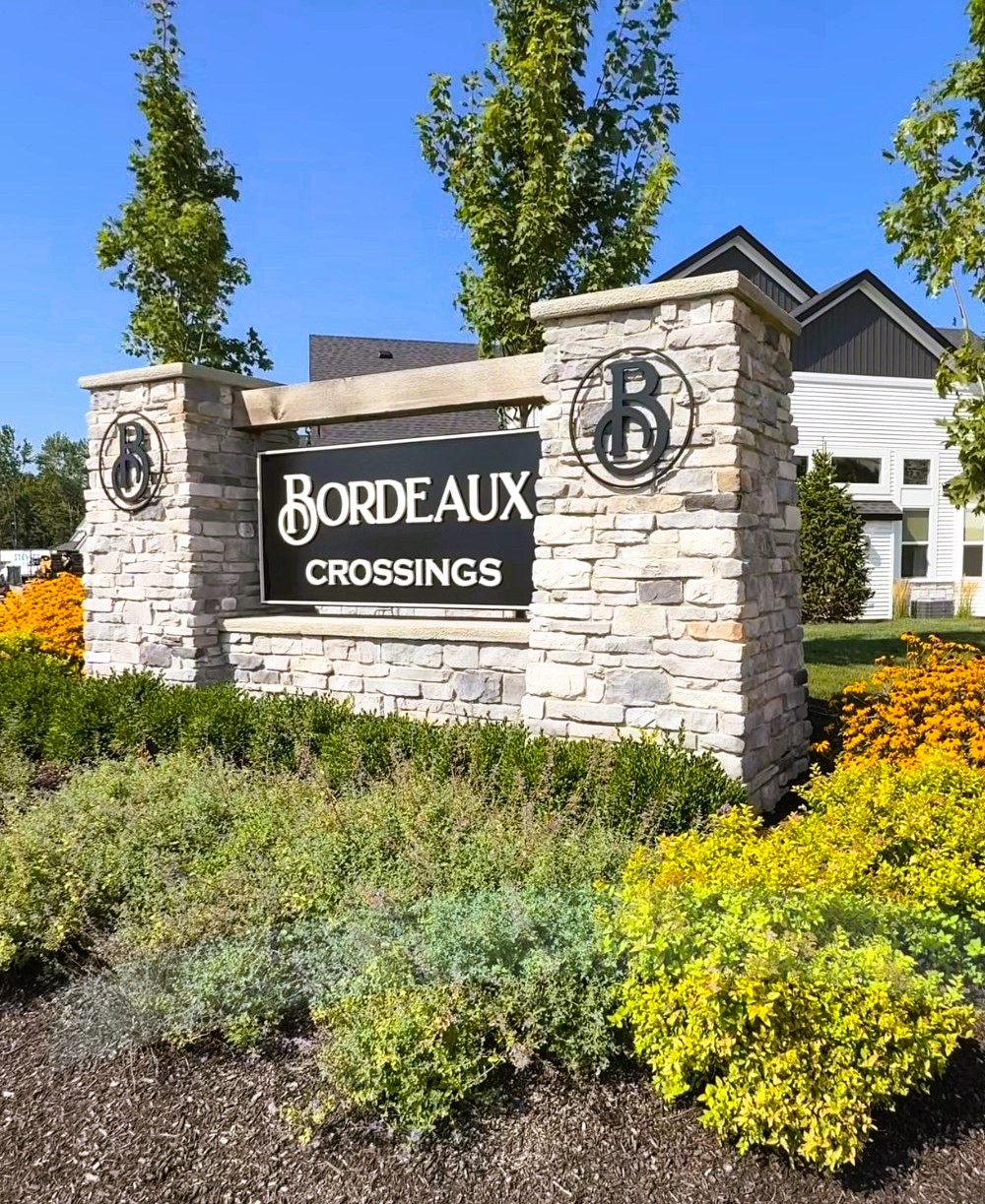 There are two entrances to Bordeaux Crossings via Bordeaux Blvd off the north side of Boston Road, and Calistoga Ct off the east side of Broadview Rd. Entrances are ornamented by a landscaped bed with a stacked stone signage wall.