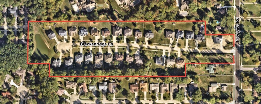 Breckenridge Estates is a single-street community of 27 homes in northwest Strongsville, Ohio. This subdivision is located 0.4 miles north of Albion Rd, off the west side of Prospect Rd, and comprises the cul-de-sac street of Breckenridge Ln.
