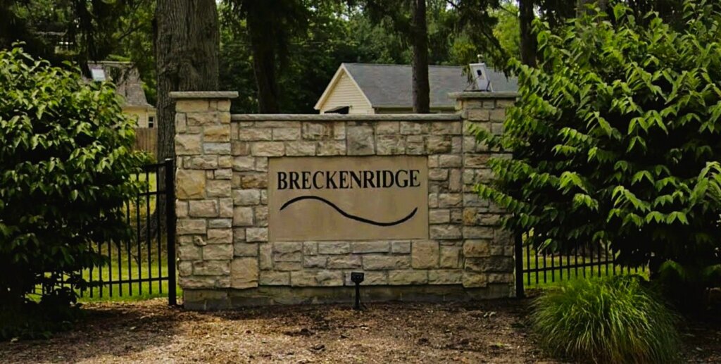 The entrance to Breckenridge Ln is flanked by landscaped beds with stacked-stone signage. A greenspace parcel with an earth berm and mature trees extends along the south side of the street, providing privacy from the existing home at the corner.