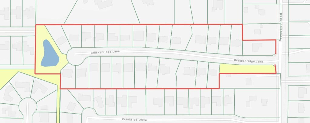 Lots are sized from 0.30 to 0.50 acres. Lots on the south side of Breckenridge Ln measure approximately 80′ wide with 50′ building setbacks. Those on the north side of the street are approximately 75′ wide with 35′ setbacks.