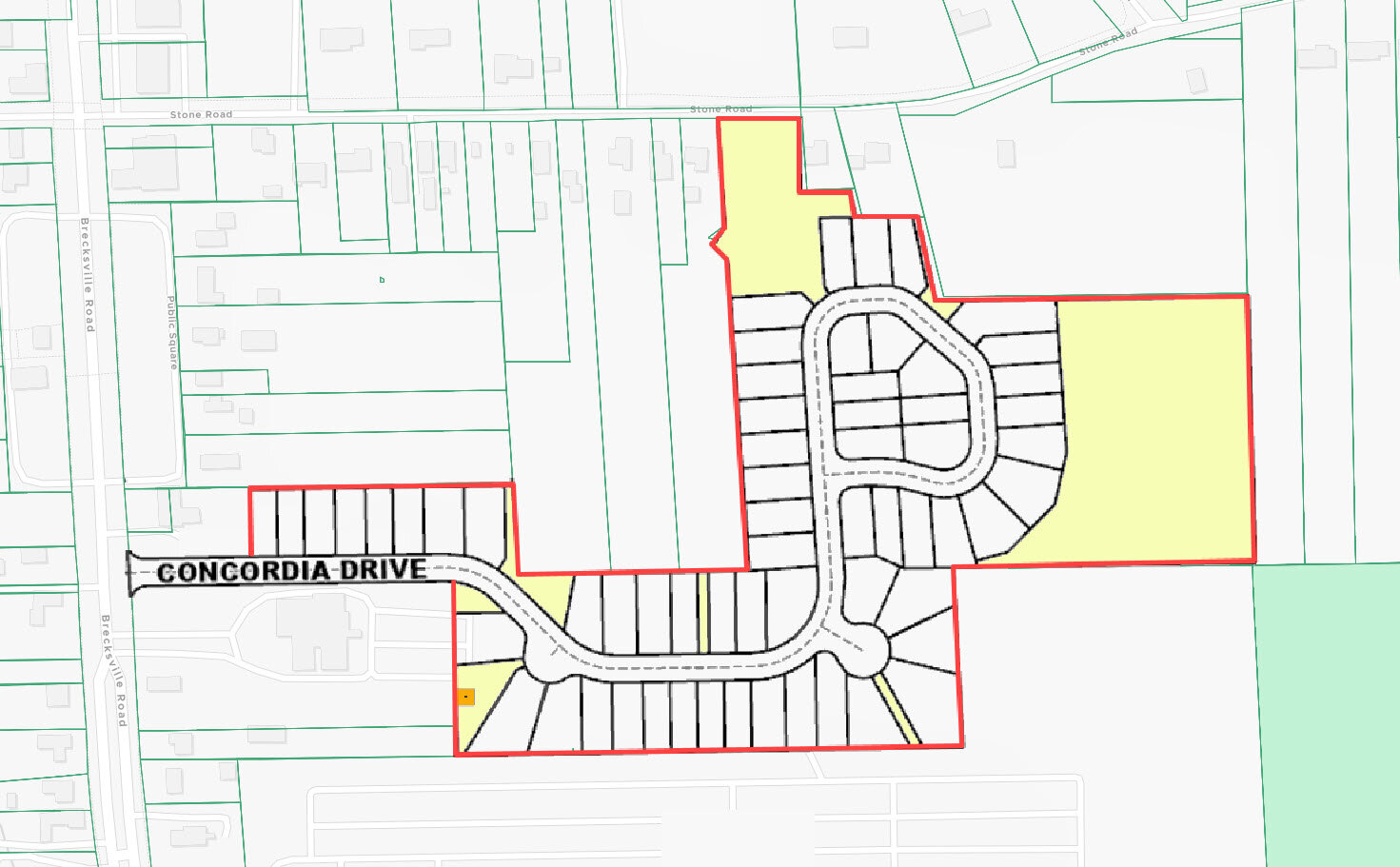 A walkway extends from the northwest corner of Concordia Dr to Stone Rd, where sidewalks extend to Brecksville Rd.