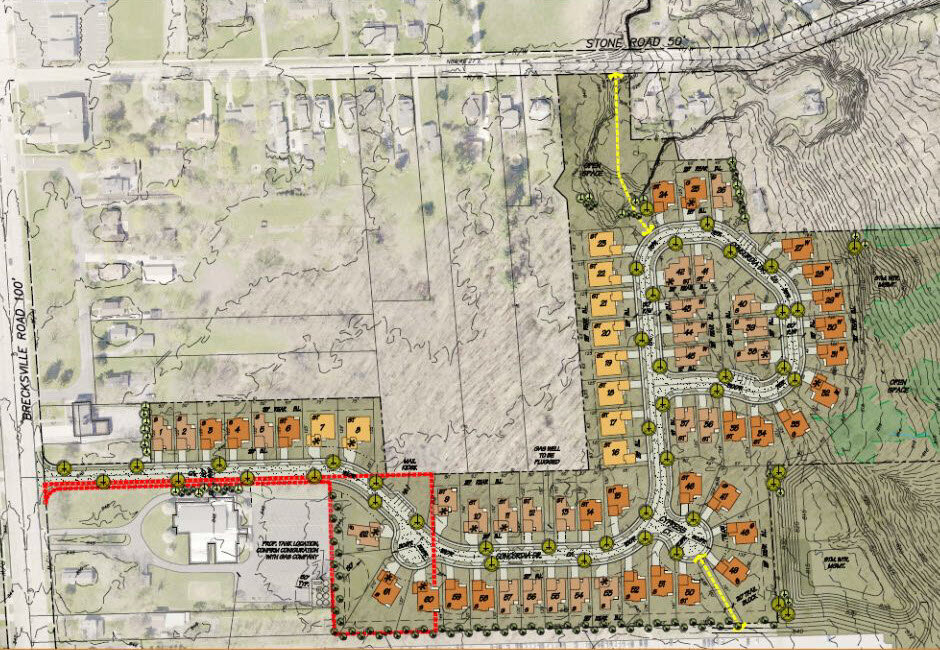 This development is bordered to the southwest by Concordia Lutheran Church and to the south by Cleveland Clinic Business Operations Center. A two-foot-tall mound with landscaping and fencing will offer privacy between the community and the surrounding parking lots.