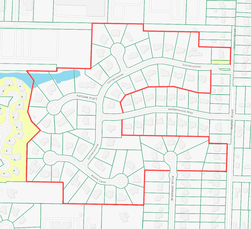 The main section (Phases 1 & 3) comprises the residential streets of Annie Ln, Cornerstone, Stone’s Throw, and Fortune Trail.