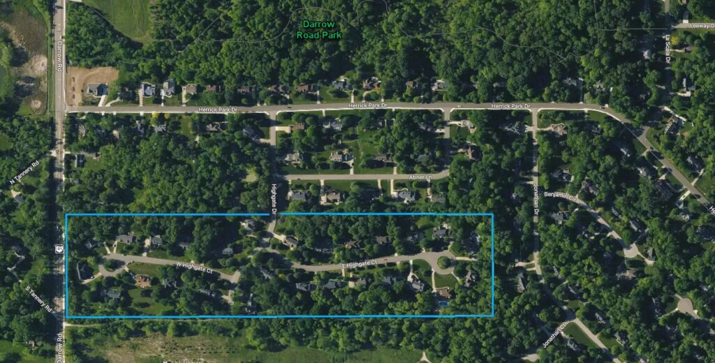 This subdivision is located east of Darrow Rd, roughly 0.7 miles south of Middleton Rd, and comprises the streets of E Highgate Ct and W Highgate Ct, and two homes at the south end of Highgate Dr. Di Novi Acres is accessible from the south side of Herrick Park Dr, through the adjoining subdivision of Western Reserve Park.