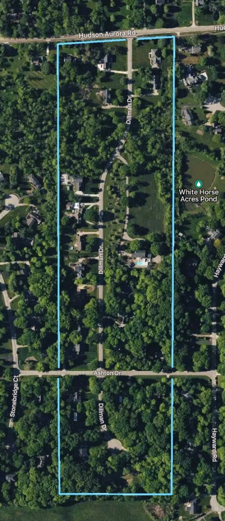 Dillman Estates is also accessible through the adjoining subdivision of White Horse Acres to the east, which also has an entrance off Hudson Aurora Rd, or through Stonebridge of Hudson to the west, which has an entrance off Stow Rd.