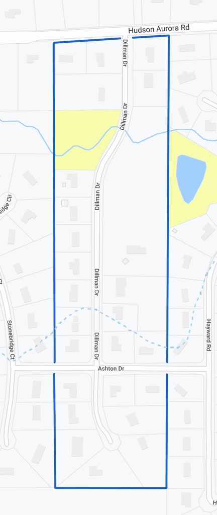 Dillman Estates is a community of 25 homes in northeastern Hudson, Ohio, conveniently around the corner from the high school. This subdivision is located off the south side of Hudson Aurora Rd, 0.2 miles east of Stow Rd, comprising Dillman Dr, four homes on Ashton Dr, and one home on Hudson Aurora Rd (house number 2756).