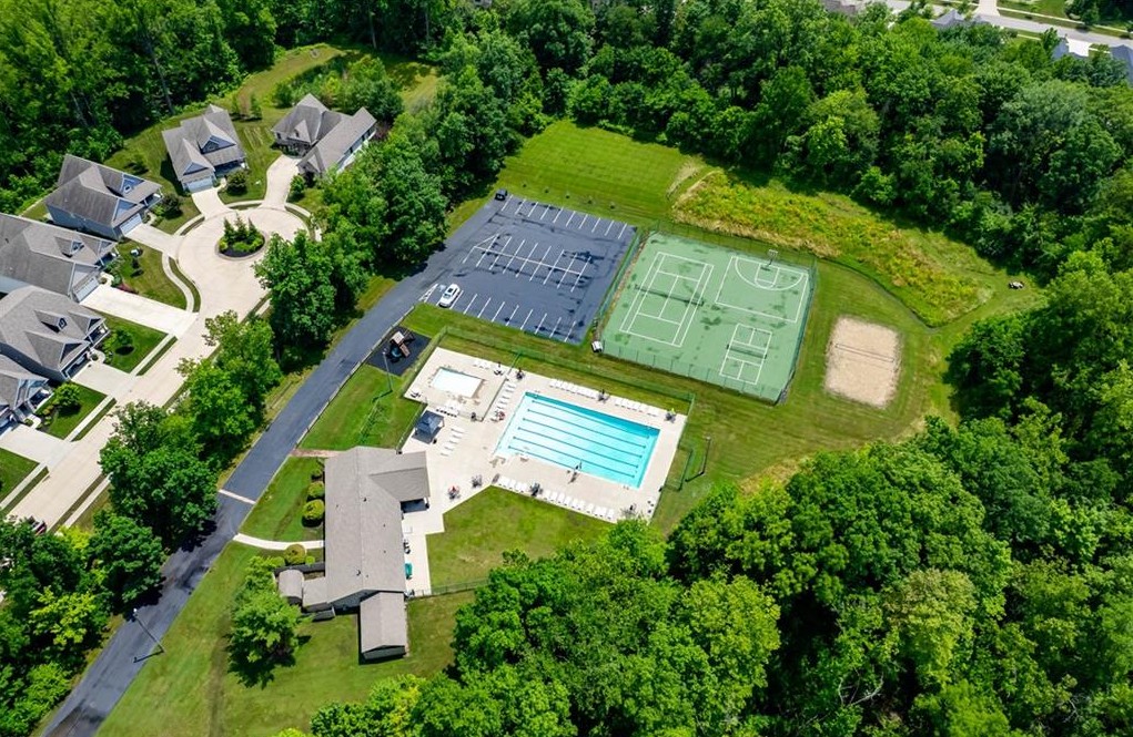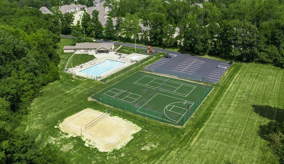True to Bob Schmitt developments, Forest Park includes common area space with recreational amenities (large yellow parcel on illustrated map above). Residents enjoy a clubhouse, Olympic-sized swimming pool, wading pool, tennis court, pickleball court, half-basketball court, sand volleyball court, play structure, and nature trails (along the ravine behind the pool) located at 11610 Park Moss Ave . The community also has a swim team for kids and teens.