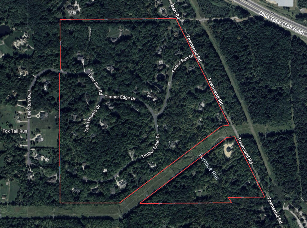 This subdivision is located along the northwest edge of Richfield Township, Ohio, off the west side of Townsend Rd, 0.4 miles south of W Snowville Rd. It encompasses the residential streets of Forest Run Dr (aka Forest Run Rd), Timber Edge Dr, Tall Timbers Dr, Deer Run Rd, one home at 3805 Deer Run Oval, and nine homes fronting Townsend Rd.