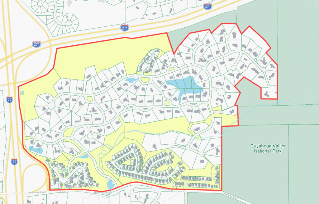 Six homes along the eastern edge of the subdivision abut the forest of Cuyahoga Valley National Park (green area on map above).