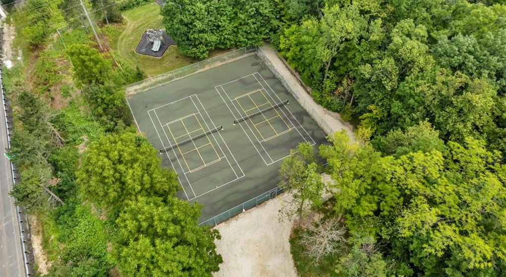 Recreational amenities include two tennis courts, a playground, a 70-person capacity picnic pavilion with a giant wood-burning fireplace that overlooks natural slate “Bridal Veils” Falls, and 120+ acres of undisturbed nature with three miles of forested nature trails alongside ravines, lakes, creeks, and waterfalls, presenting opportunities for fishing and wildlife viewing.