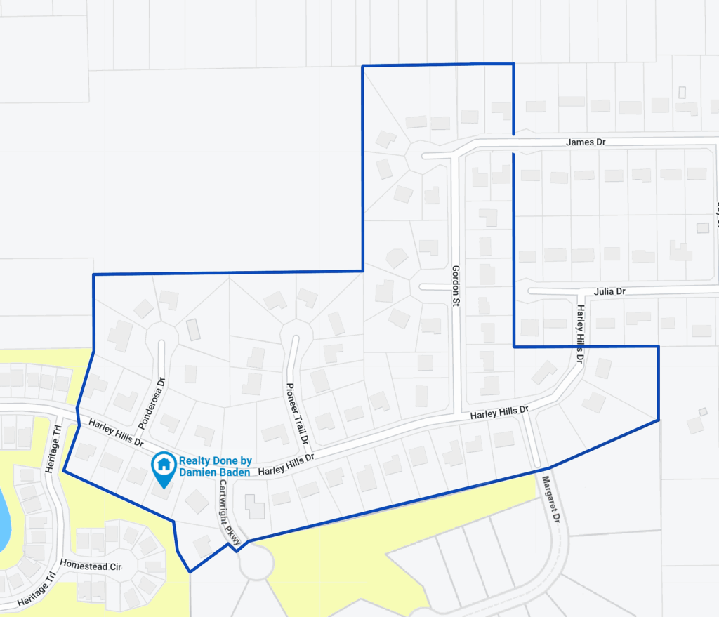 The single-family homes of Harley Hills Estates begin east of Heritage Trl.