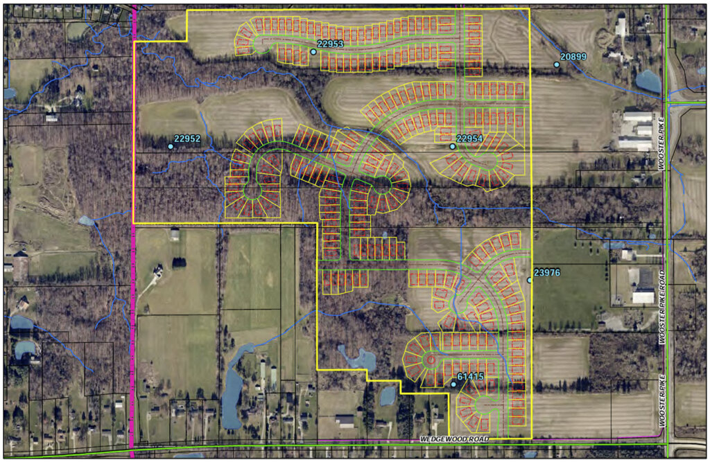 This subdivision is located off the north side of Wedgewood Road (SR 162), roughly 0.3 miles west of Wooster Pike (SR 3). It will comprise the streets of Cooper Hawk Dr, Crested Eagle Dr, Golden Eagle Ct, Gray Hawk Ln, Northern Harrier Ct, Peregrine Ct, Sparrow Hawk Ct, and the south half of Waterbury Dr.