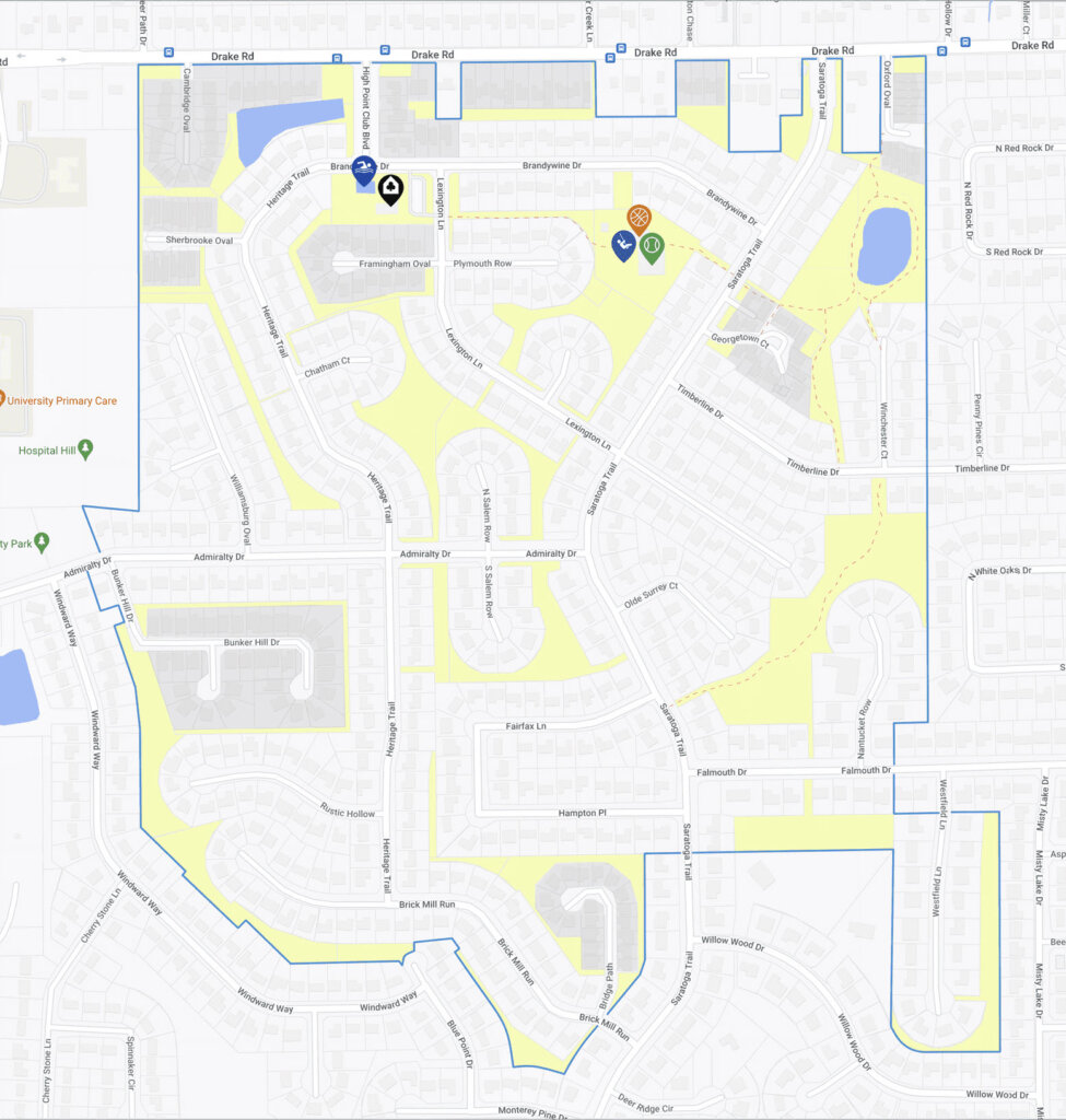 The single-family homes of High Point comprise the streets of Admiralty Dr, Brandywine Dr, Brick Mill Run, Chatham Ct, Fairfax Ln, Framingham Oval, Hampton Pl, Heritage Trl, High Point Club Blvd, Lexington Ln, Nantucket Row, Olde Surrey Ct, Plymouth Row, Rustic Hollow, N Salem Row, S Salem Row, Wellington Ct, Westfield Ln, Weymouth Ln, Williamsburg Oval, Winchester Ct, Yorktown Oval, the west end of Falmouth Dr (west of Nantucket Row), the north half of Saratoga Trl (north of Hampton Pl), and the west end of Timberline Dr (west of Winchester Ct).