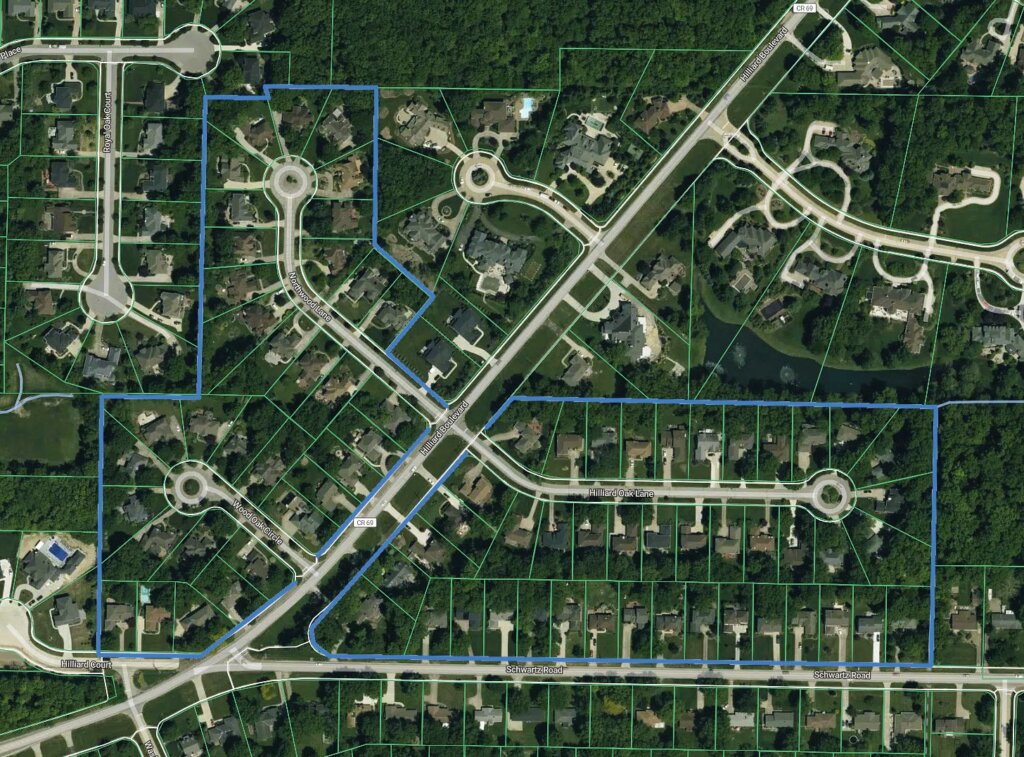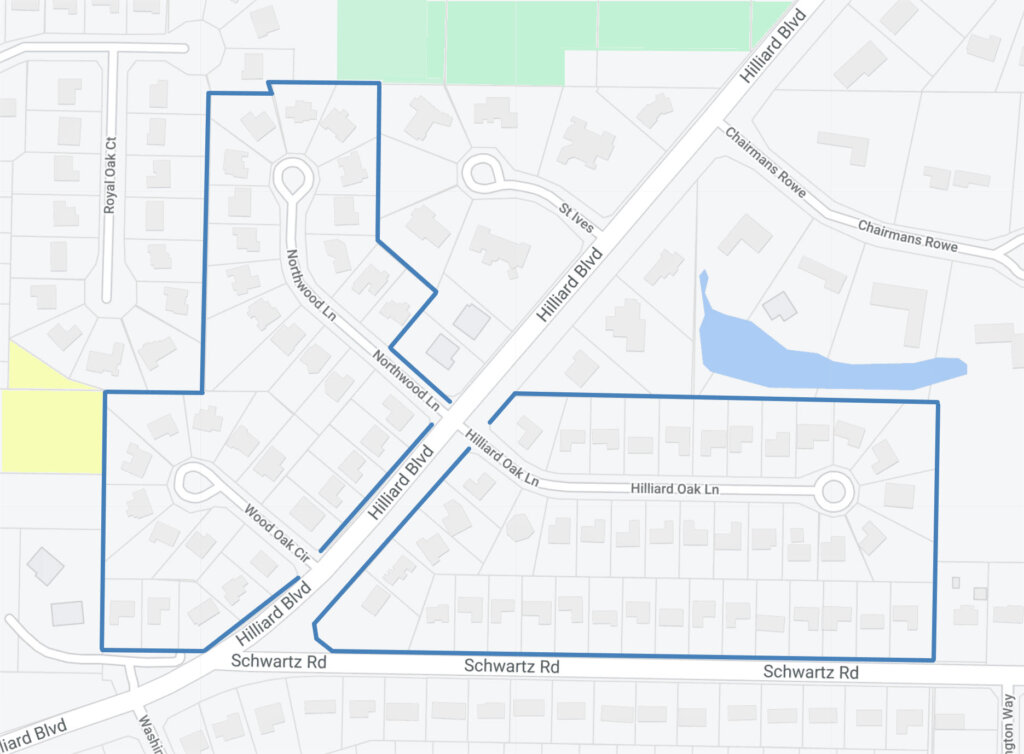 This subdivision is located along the intersection of Schwartz Rd and Hilliard Blvd. It encompasses three residential cul-de-sac streets (Hilliard Oak Ln, Northwood Ln, and Wood Oak Cir), and three homes along the east end of Hilliard Ct, five homes along the west side of Hilliard Blvd (even house numbers 30338-30396), and fifteen homes along the north end of Schwartz Rd (even house numbers 29840-29630).