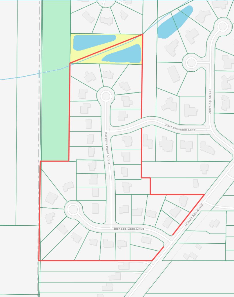 This subdivision is located 0.4 miles west of Bradley Rd, off the west side of Hilliard Blvd. It comprises the residential streets of Bishops Gate Cir and Parsons Pond Cir, and three homes on Hilliard Blvd (house numbers 31206, 31218 & 31230).
