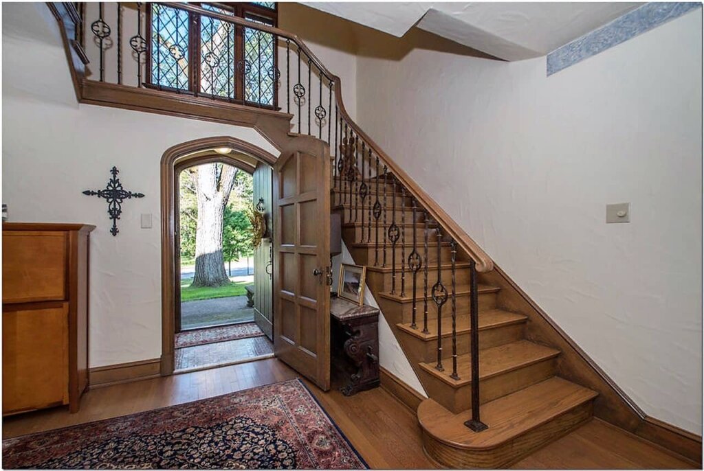 Additional Tudor elements include hardwood floors on the first floor, arched entryways, inlaid panel doors, and textured plaster walls and ceilings.
