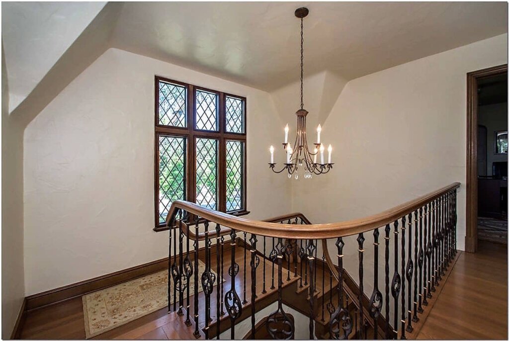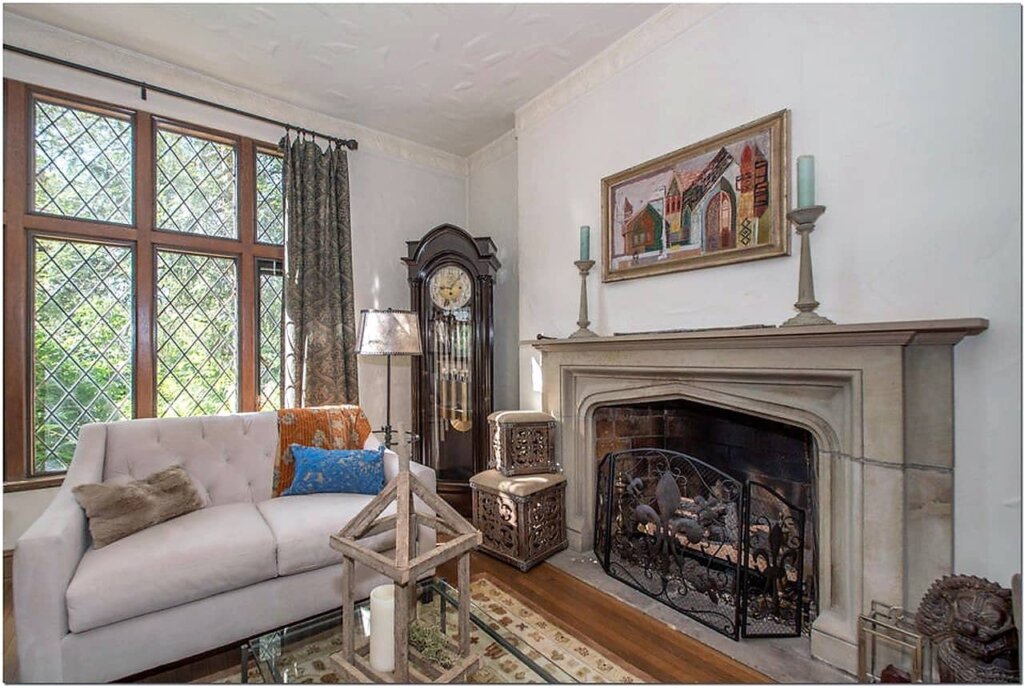 Built in 1928, the charming Cotswold Tudor Revival at 257 Atterbury Blvd looks straight out of a storybook. The front elevation features a stucco exterior with a stone central facade and prominent stone chimney. Rectangular mullioned casement windows with either diamond-paned leaded glass or square muntons (grids) have full stone surround, hoodmolds and side blocking. Framing the original oak plank door is a Tudor arch stone surround with label moulding (hoodmold), and diamond-shaped label stops.