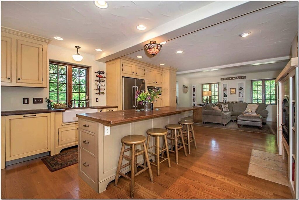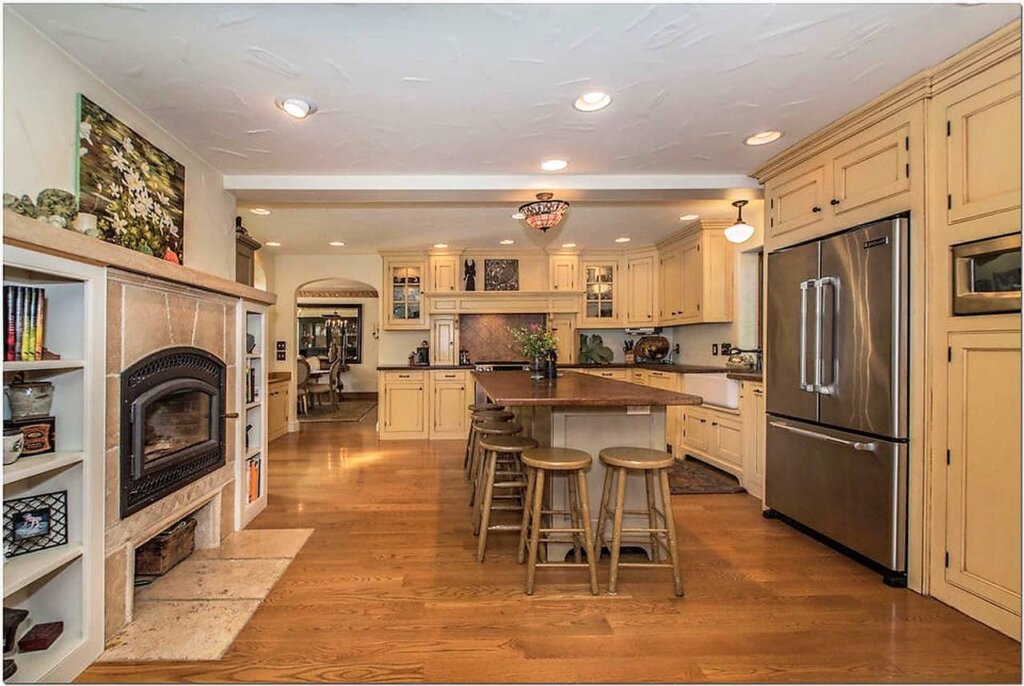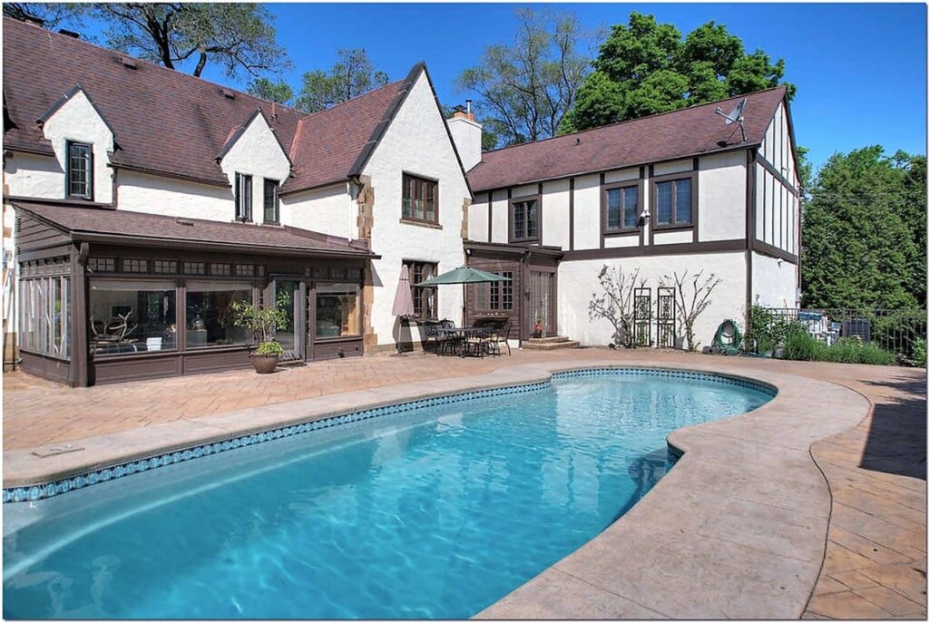 Inside, there are 4,490 square feet with 6 bedrooms and 4.5 bathrooms. The tiled entry alcove offers a coat closet and convenient powder room on the opposite side. An elegant oak turned staircase with original gothic wrought iron railing frame the foyer. Stepping through the arched entryway into the sunken living room, the original Tudor arch masonry fireplace and latticed leaded glass windows offer old-world ambiance. Double glass doors lead to the vaulted sunroom with tile flooring and views of/access to the terrace and pool. Adjacent to the kitchen is a spacious formal dining room with decorative cornices, as is in the living room. The renovated and expanded kitchen includes handcrafted cabinets, a center island with seating, concrete countertops, and original wood-burning oven/fireplace, which is open to the family room. Modern conveniences include a laundry room, mudroom with cubbies, and a full bathroom on the first floor.