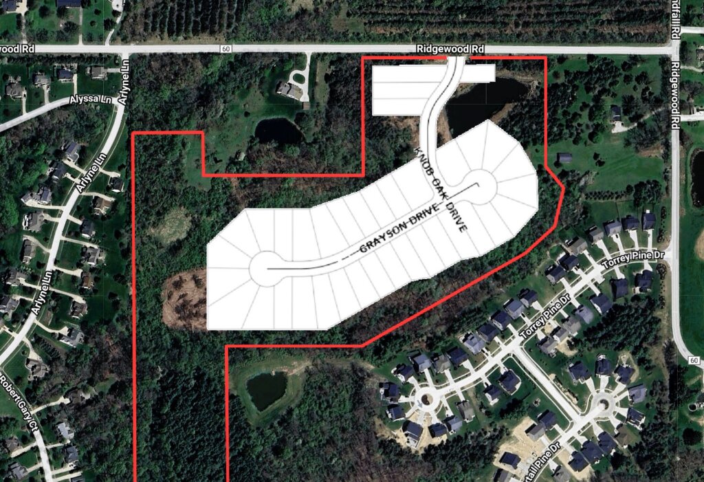 This subdivision is located off the south side of Ridgewood Rd, 0.2 miles west of the terminus of Windfall Rd, and comprises the streets of Grayson Dr and Knob Oak Dr.