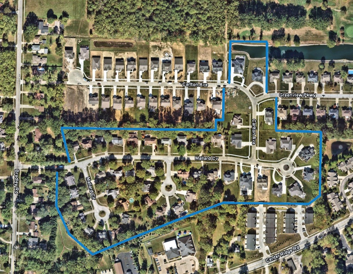 This subdivision is located off the east side of Bradley Rd, roughly 0.2 miles north of Center Ridge Rd. It comprises the residential streets of Mallard Cv, Mallard Cir and Teal Ct, two homes on the west end of Greenview Pkwy, and three homes on the east end of Carlton Ave.