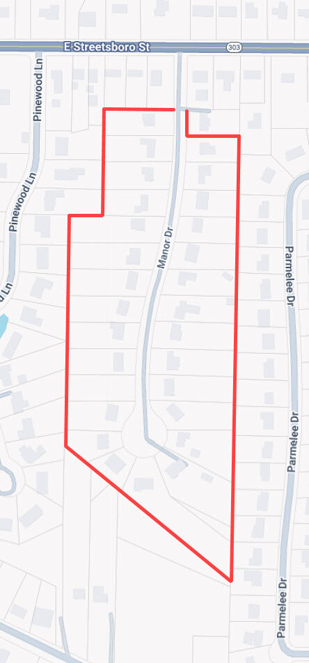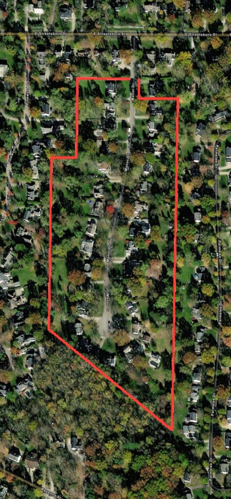 This subdivision comprises the cul-de-sac street of Manor Drive, located 0.7 miles east of Main St, off the south side of E Streetsboro St.