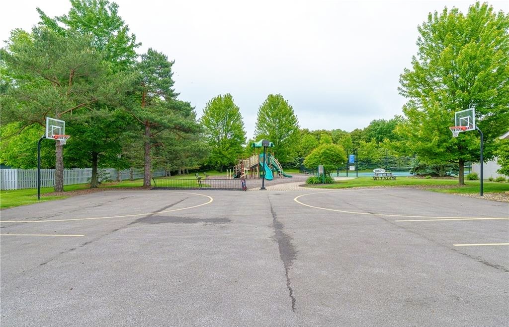 Meadowood amenities include a rentable clubhouse with a full kitchen (150-person occupancy), an Olympic-size pool, a wading pool with a spray fountain, a playground, two full-sized courts lined for tennis and pickleball, and a basketball court (located at the east end of the parking lot). Neighborhood amenities are located at 10901 Gate Post Rd.