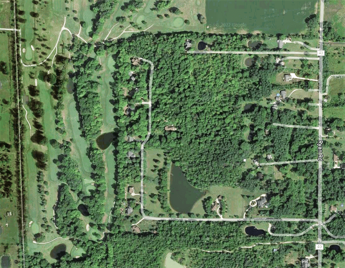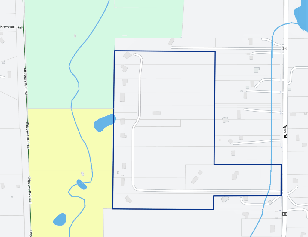 This community is located along a private drive off the west side of Ryan Rd, 0.6 miles north of Chippewa Rd. The private L-shaped drive comprises Ryan Rd addresses, encompassing house numbers 6760, 6788, 6790, 6818, 6822, 6848, 6852, 6884, 6896, 6906, 6918 and 6924.