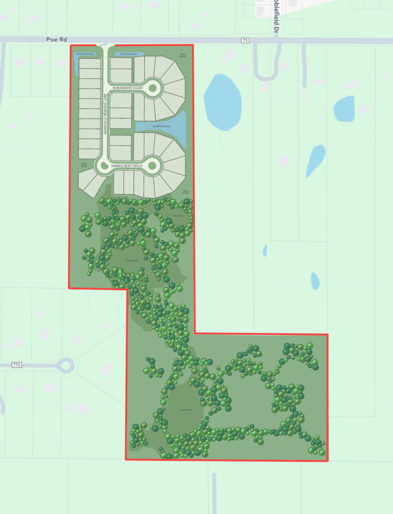 Community greenspace totals 40.6 acres. The greenspace section south of homes is heavily forested, offering a wooded backdrop and privacy to abutting homes.