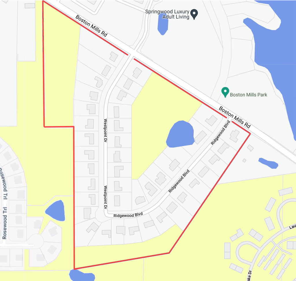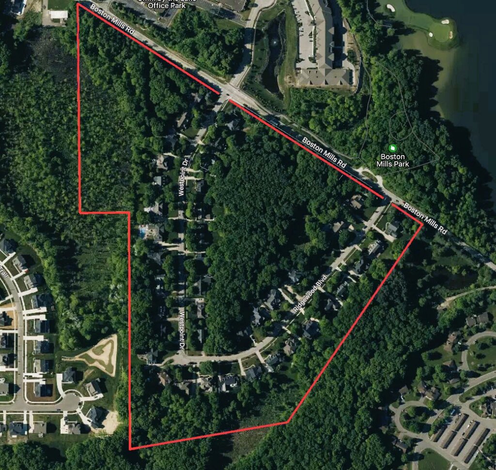 This subdivision comprises the streets of Ridgewood Blvd and Westpoint Dr, located 1.2 miles east of Chittenden Rd/OH-8 off the south side of Boston Mills Rd.