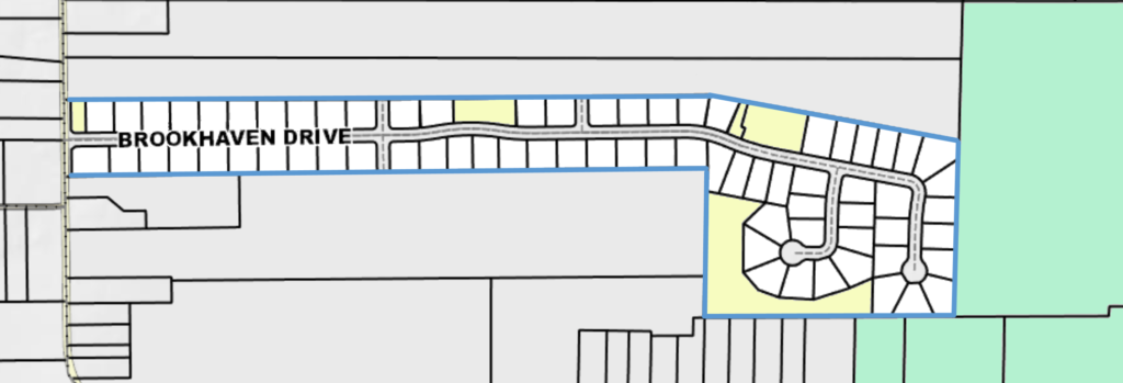 At the east end of the development, Phase 2 lots (Glenbrook Cir & 4214-4581 Brookhaven Dr) and measure approximately 100′ wide and ≥150′ deep, ranging from 0.46 to 0.73 acres.