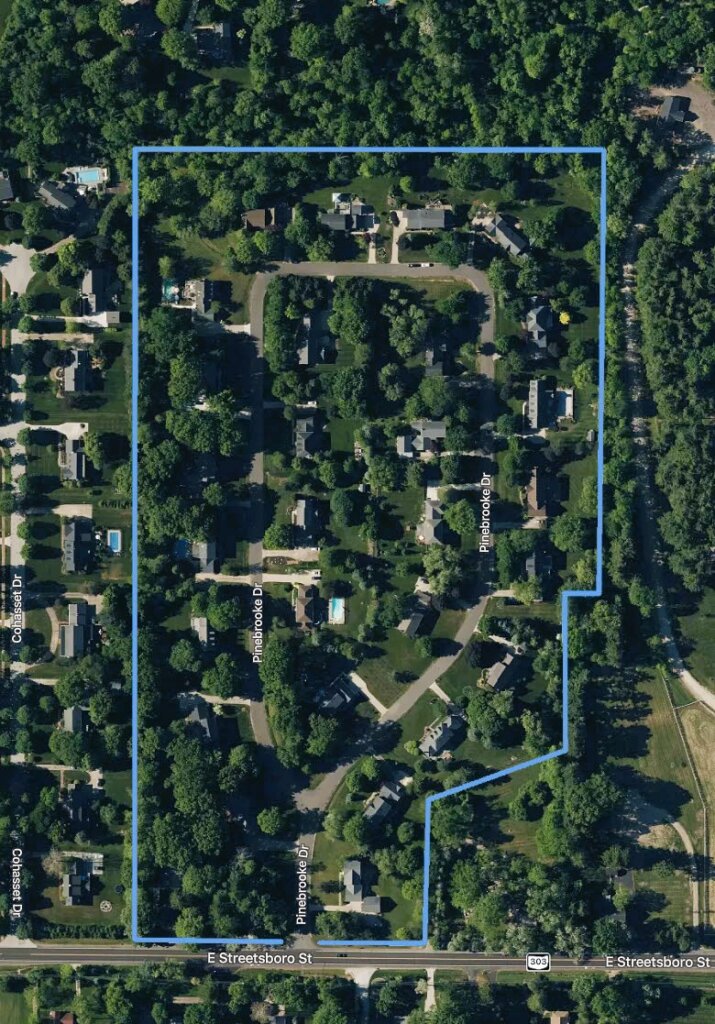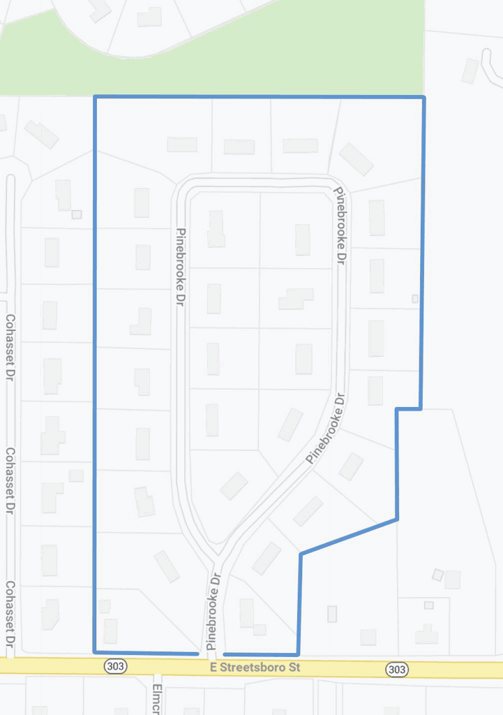 Pinebrooke, in northeastern Hudson Ohio, is a single-street community of 29 homes near the city’s school campus. This subdivision is located a half-mile west of Stow Rd, off the north side of E Streetsboro St, and comprises Pinebrooke Dr and one home on E Streetsboro St.