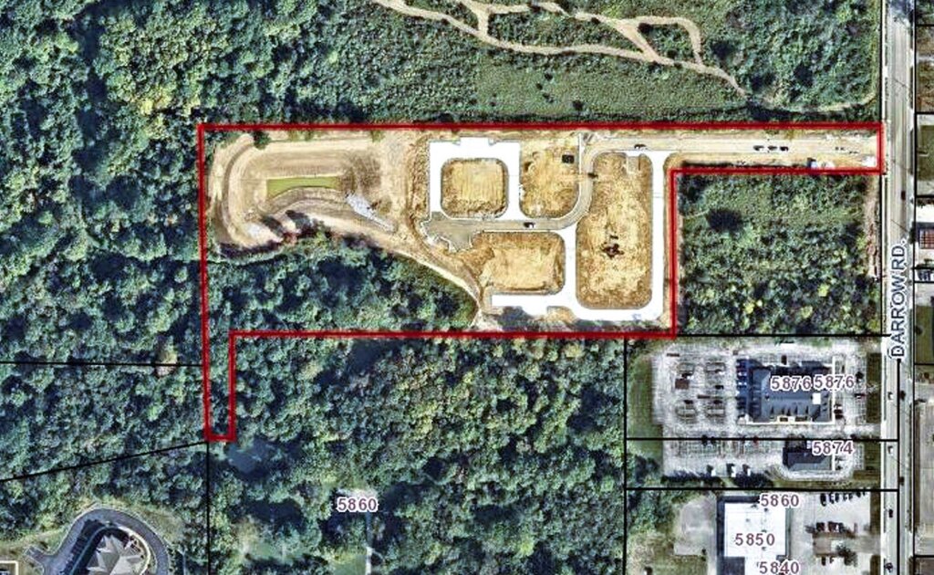 The 2.89-acre parcel bordering Darrow Rd (light gray section on above-illustrated map) is reserved for future development.