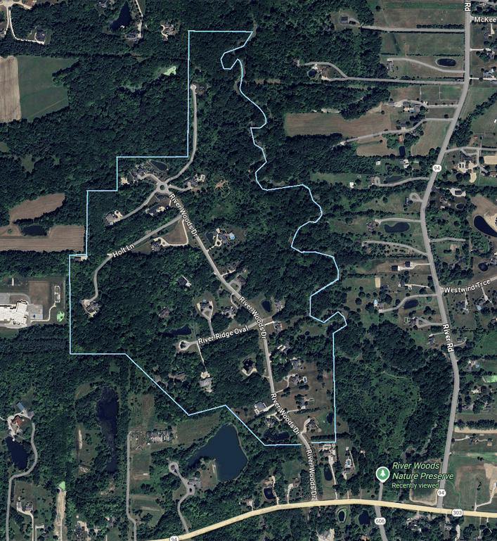 The first few homes on the east side of River Woods Dr abut the 30-acre River Woods Nature Preserve (green parcel on map above), which has a ¾ mile nature trail through shrub, brush and woodlands.