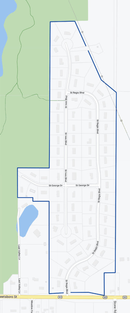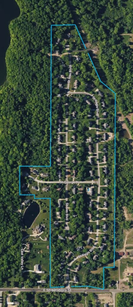 St. Andrews Commons is a community of 75 homes in northeastern Hudson, Ohio, adjacent to the dense forest of the city’s keystone park with direct access to its trails. This subdivision is located 0.9 miles east of Stow Rd, off the north side of E Streetsboro Rd, and comprises the streets of St George Dr, St Ives Blvd and St Regis Blvd.