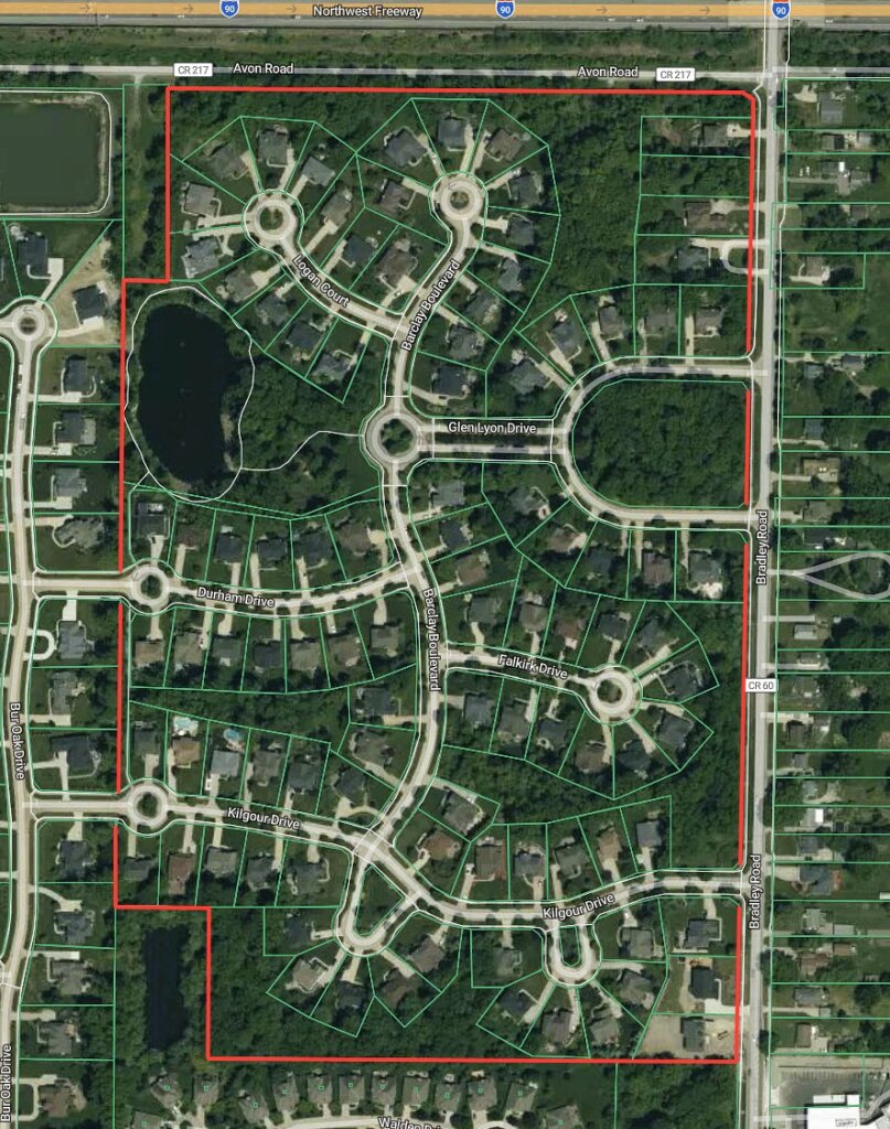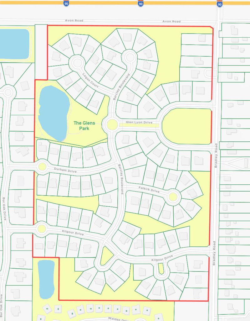 The Glens comprises 96 semi-custom homes along the residential streets of Barclay Blvd, Glen Lyon Dr, Kilgour Dr, Logan Ct, Durham Dr, and Falkirk Dr, and seven homes on Bradley Rd (even house numbers 1384-1726).