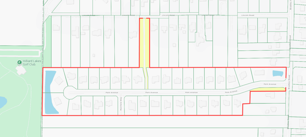 The cul-de-sac abuts Hilliard Lakes Golf Club (green section on above-illustrated map).