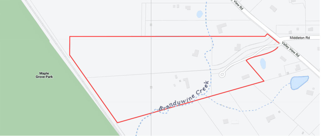 Brandwine Creek intersects several properties, presenting scenic rolling topography. Stream-adjacent lots have riparian setbacks.