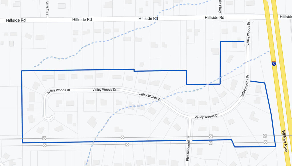 The subdivision of Valley Woods is located in southwest Independence, Ohio, near the border of Seven Hills, off the south side of Hillside Rd, immediately west of I-77.