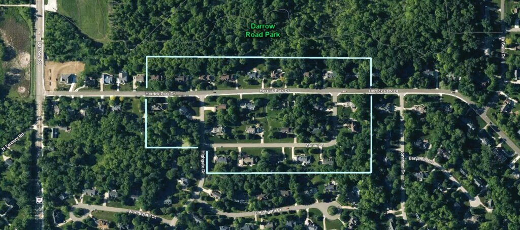 The 60-acre Darrow Road Park borders this community to the north, with nine homes backing to its forest for endless views of nature. Nature and fitness enthusiasts will appreciate the park’s 1.25-mile walking trail. Entrances to the trail are located off the parking lot on Darrow Rd and off Lascala Dr across from its intersection with Leeway Dr ― both walkable in 10 min or less.