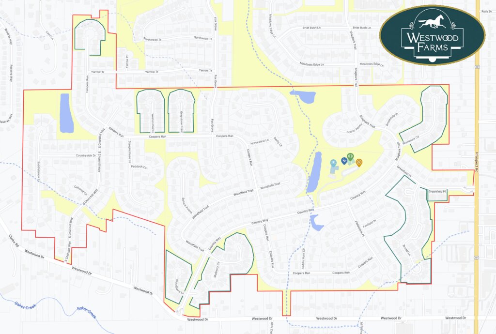 The 426 single-family homes of Westwood Farms comprise the streets of Brookfield Pl, Calumet Cir, N Churchill Way and S Churchill Way, Country Way, Countryside Dr, Derby Ct, Fairfield Pl, Fieldstone Pt, Horseshoe Ln, Paddock Cir, Saddle Horn Cir, Saddlebrook Ln, Scenic Pointe, Spruce Pt, Steeplechase Ln, most of Coopers Run (excluding the north end and cul-de-sac), the north side of Greenfield Pl, the southern half of Fox Grove and its cul-de-sac, the southern half of Shagbark Trl, most of Woodfield Trl, and six homes on the west end of Yarrow Trl.