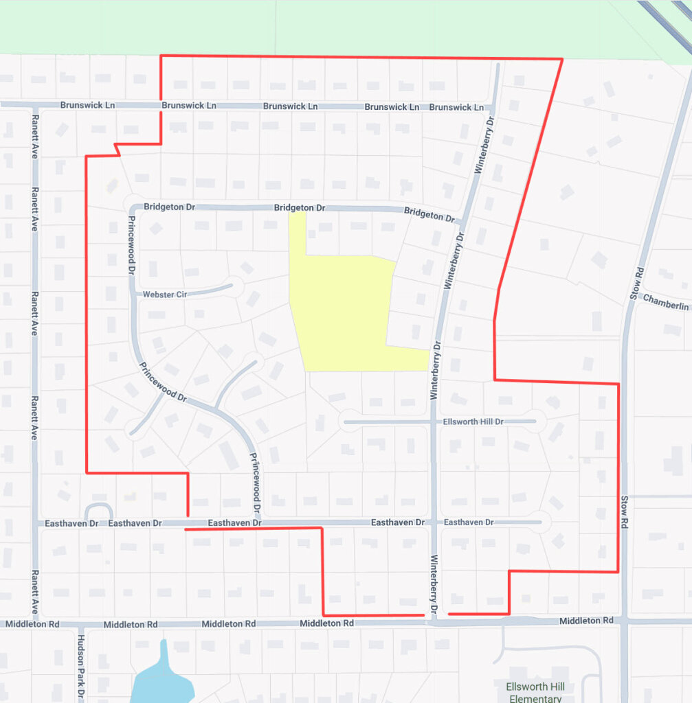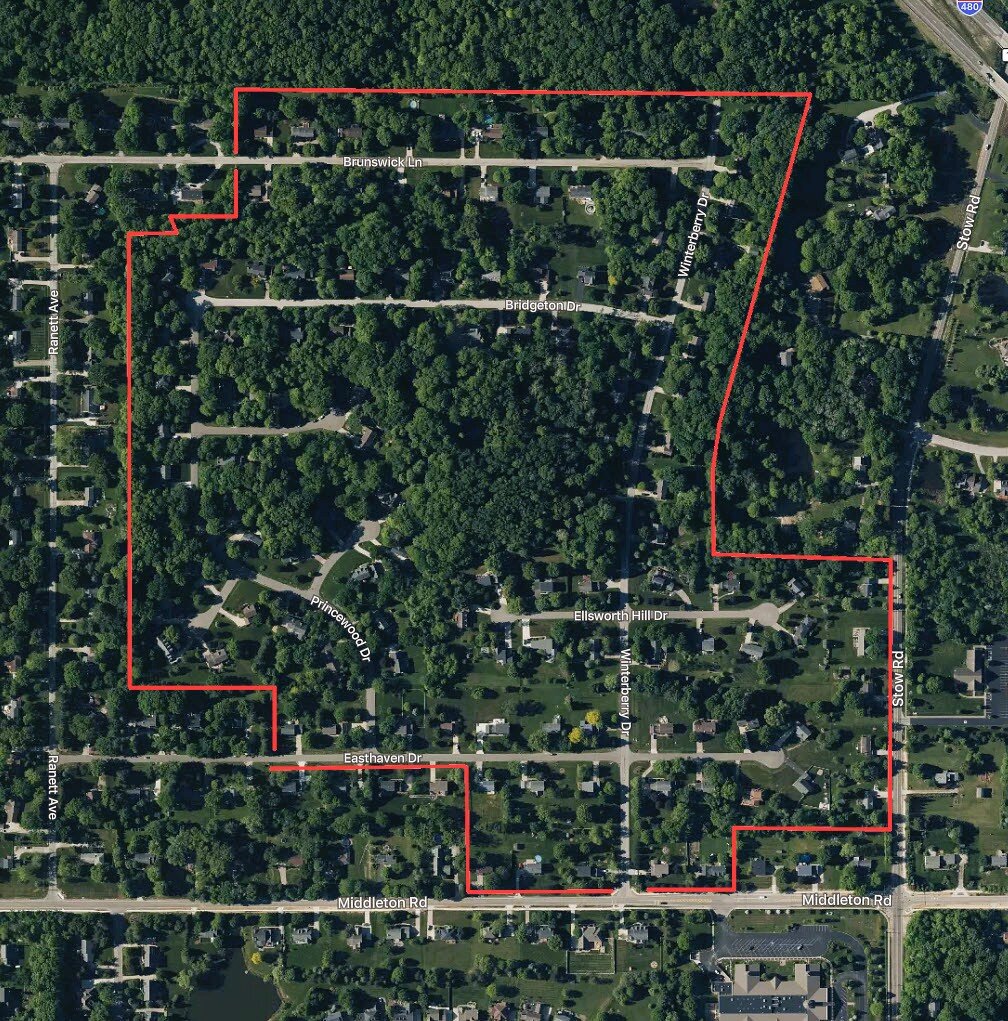 This subdivision is located off the north side of Middleton Rd, 0.2 miles west of Stow Rd. It comprises the streets of E Blackthorn Cir, W Blackthorn Cir, Bridgeton Dr, Ellsworth Hill Dr, Princewood Dr, Webster Cir, Winterberry Dr, the east half of Brunswick Ln (house numbers 2580-2707), and the east half of Easthaven Dr (house numbers 2591-2744).