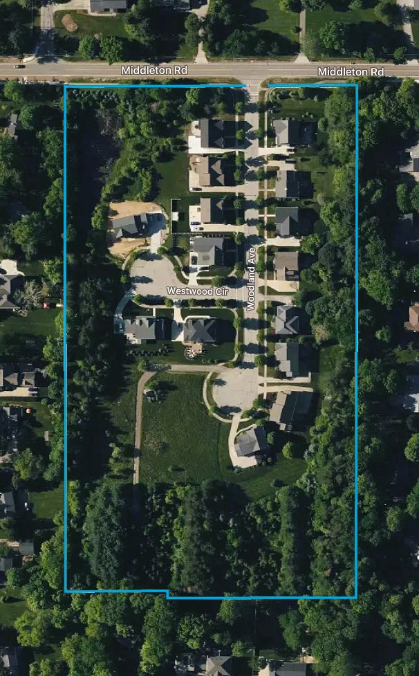 Woodland Estates is a quaint 15-home community surrounded by conservation land and conveniently walkable to the Elementary School. This subdivision is located in northeast Hudson, Ohio (Summit County), off the south side of Middleton Rd, 0.6 miles west of Stow Rd, and comprises the streets of Woodland Ave and Westwood Cir.