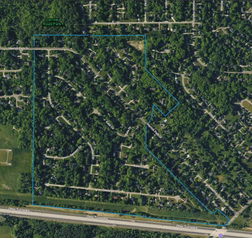 Woods of Western Reserve is located north of I-80, between Hudson Aurora Rd and Darrow Rd. It encompasses the streets of Benjamin Cir, Herrick Cir, Jesse Dr, Jonathan Cir, Jonathan Dr, Kate Dr, Kate Cir, Kate Ct, and Samson Cir, homes along the middle section of Herrick Park Dr, and three homes on Lascala Dr.