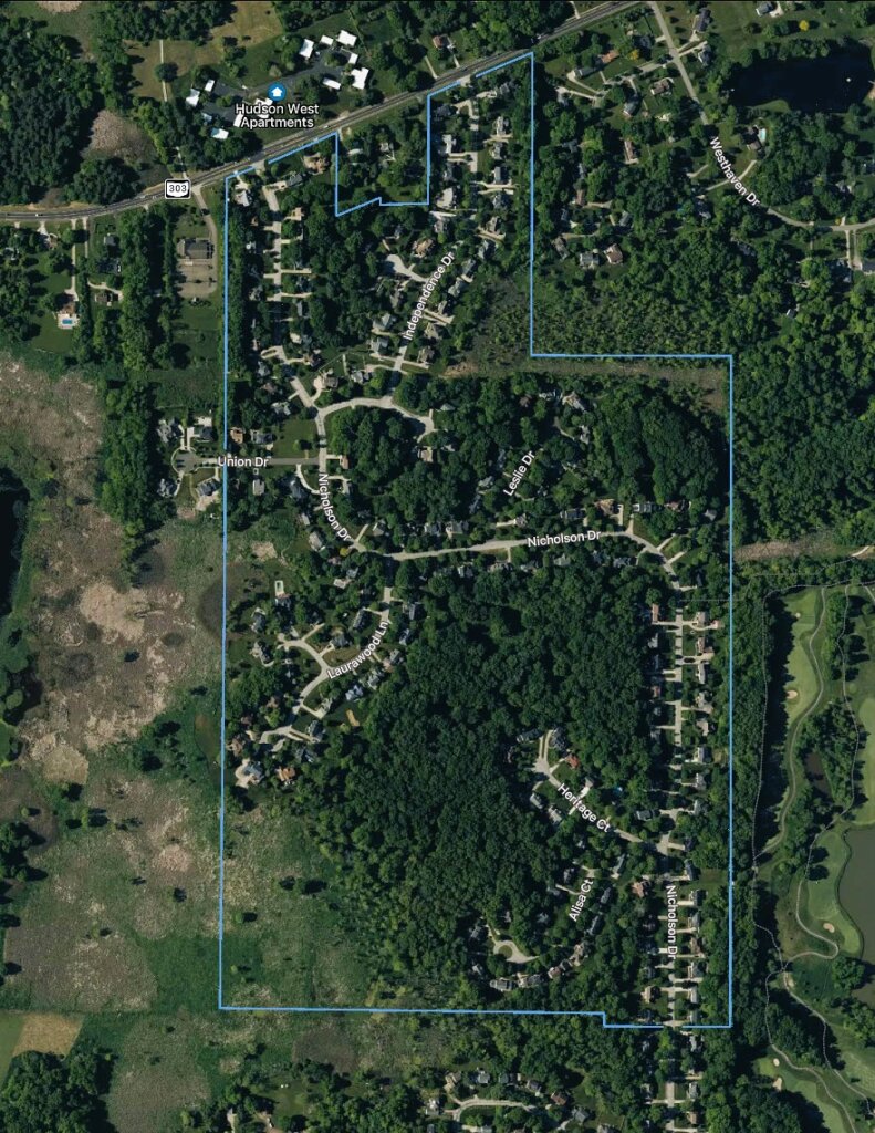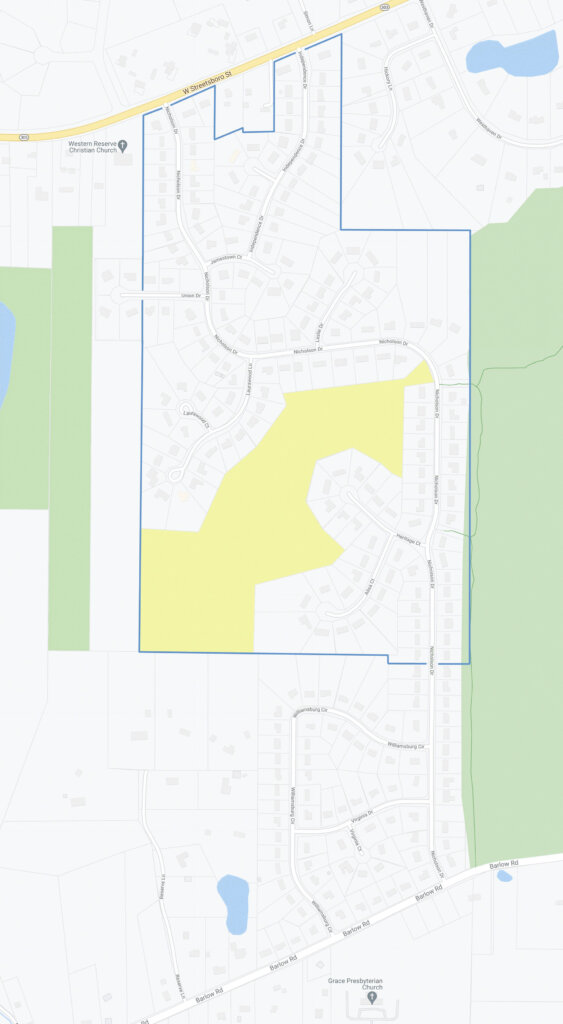 This subdivision is located roughly 1.3 miles west of Main St, off the south side of W Streetsboro St. It comprises the streets of Alisa Ct, Heritage Ct, Independence Dr, Jamestown Ct, Laurawood Ct, Laurawood Ln, Leslie Dr, the northern half of Nicholson Dr (house numbers 5751-6170), four homes on Union Dr (excluding the cul-de-sac), and three homes on W Streetsboro St (house numbers 398, 412, 466 & 474).