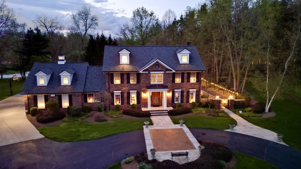 No expense was spared in updating the exterior of this stately brick Georgian, selecting built-to-last construction materials including CertainTeed’s top-tier 50-year dimensional shingles, copper roof components, Marvin windows (back of home), and Hardie fiber cement siding.