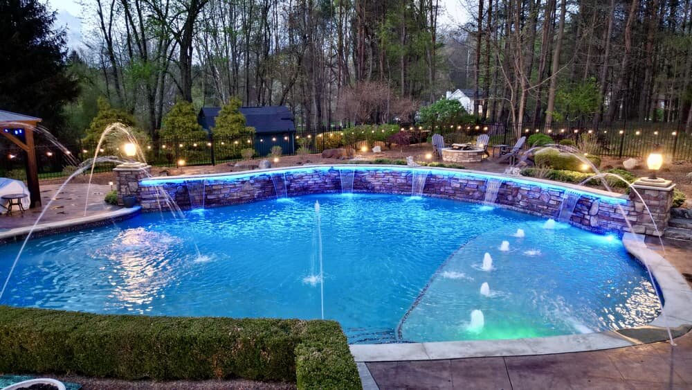Twelve fountains splash into the pool—six cascade waterfalls from the raised stone bond beam and six arched jet sprays from the terrace—bestowing a captivating water show and serene spa‑like soundscape.