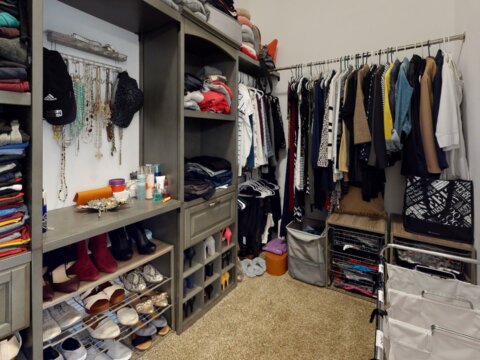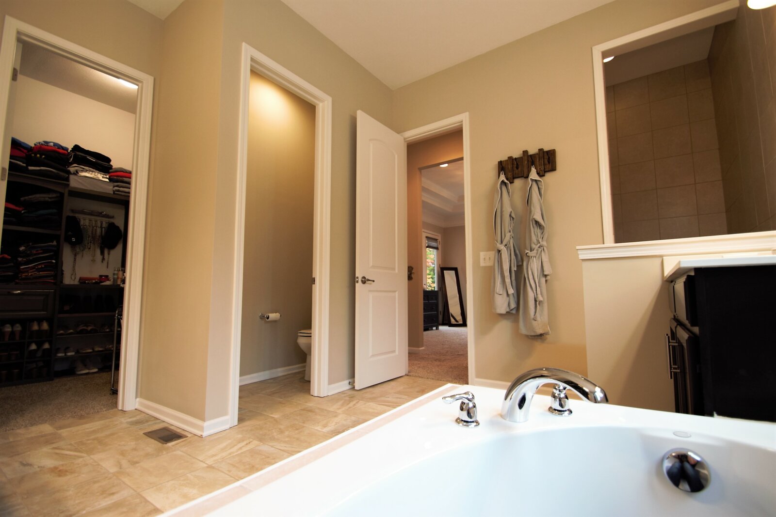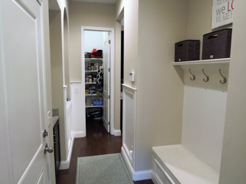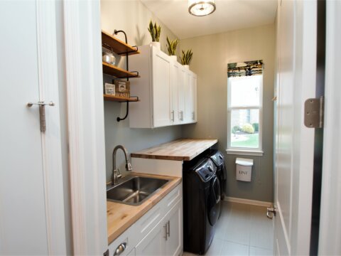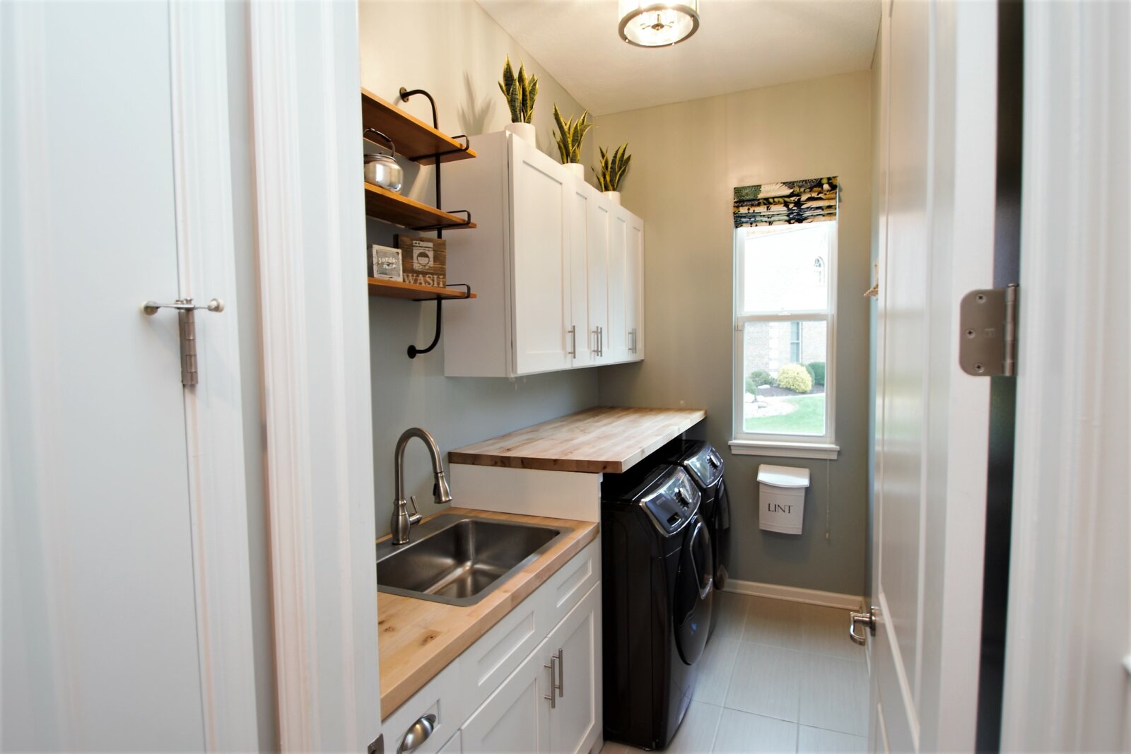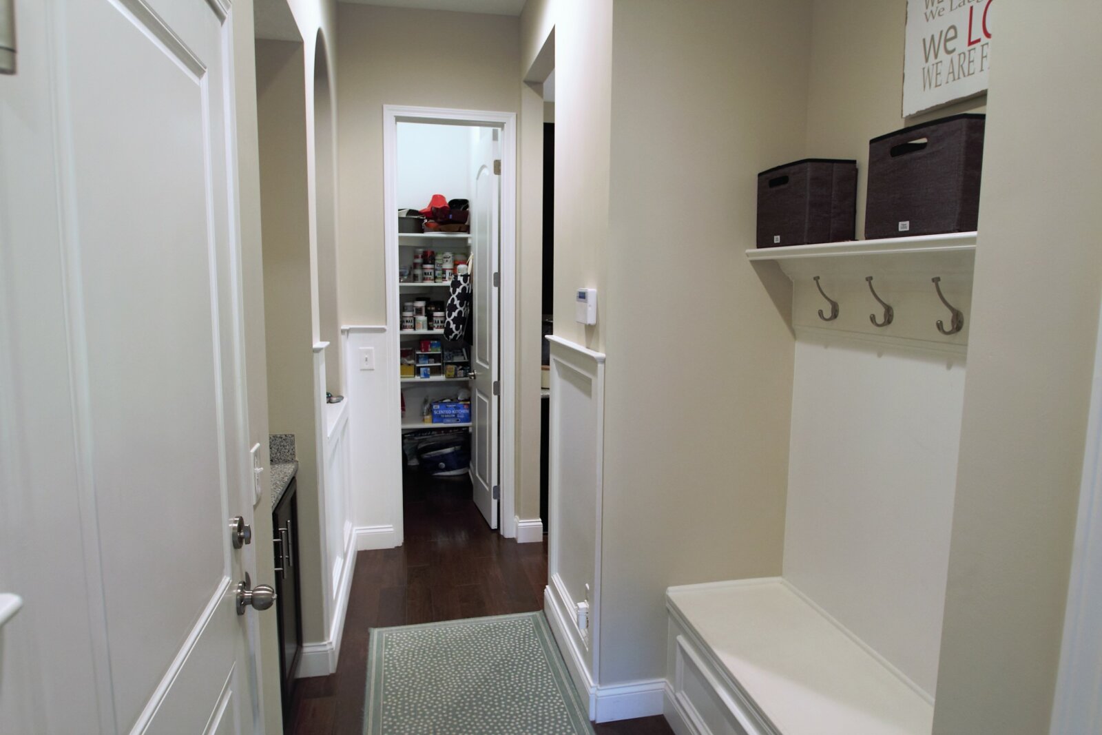 The garage enters to a mud hall with convenient built-in bench to sit and remove your shoes. Separate laundry room with built-in utility tub and cabinets.